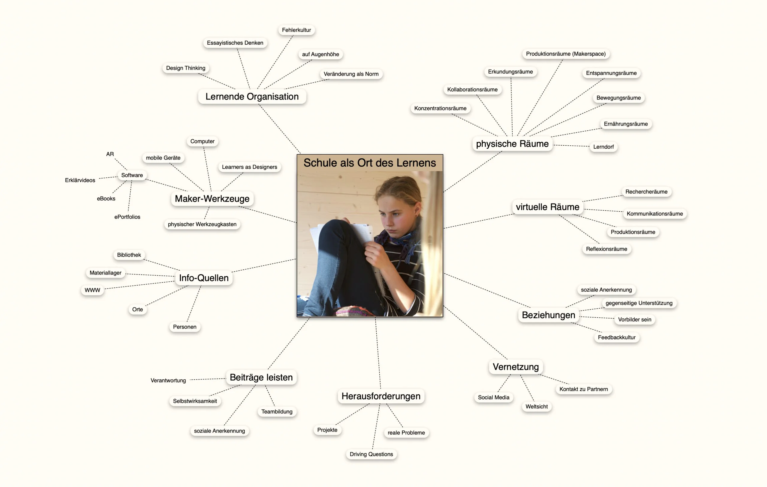 Die Triebfeder dahinter ist die intrinsische Motivation der Lerner, die pädagogischen Konzepte setzen auf aktivierende und kollaborative Tätigkeiten und die Grundhaltung ist die der Selbstorganisation. Dabei spielen dann Technologien und Lernräume eine bedeutsame Rolle.