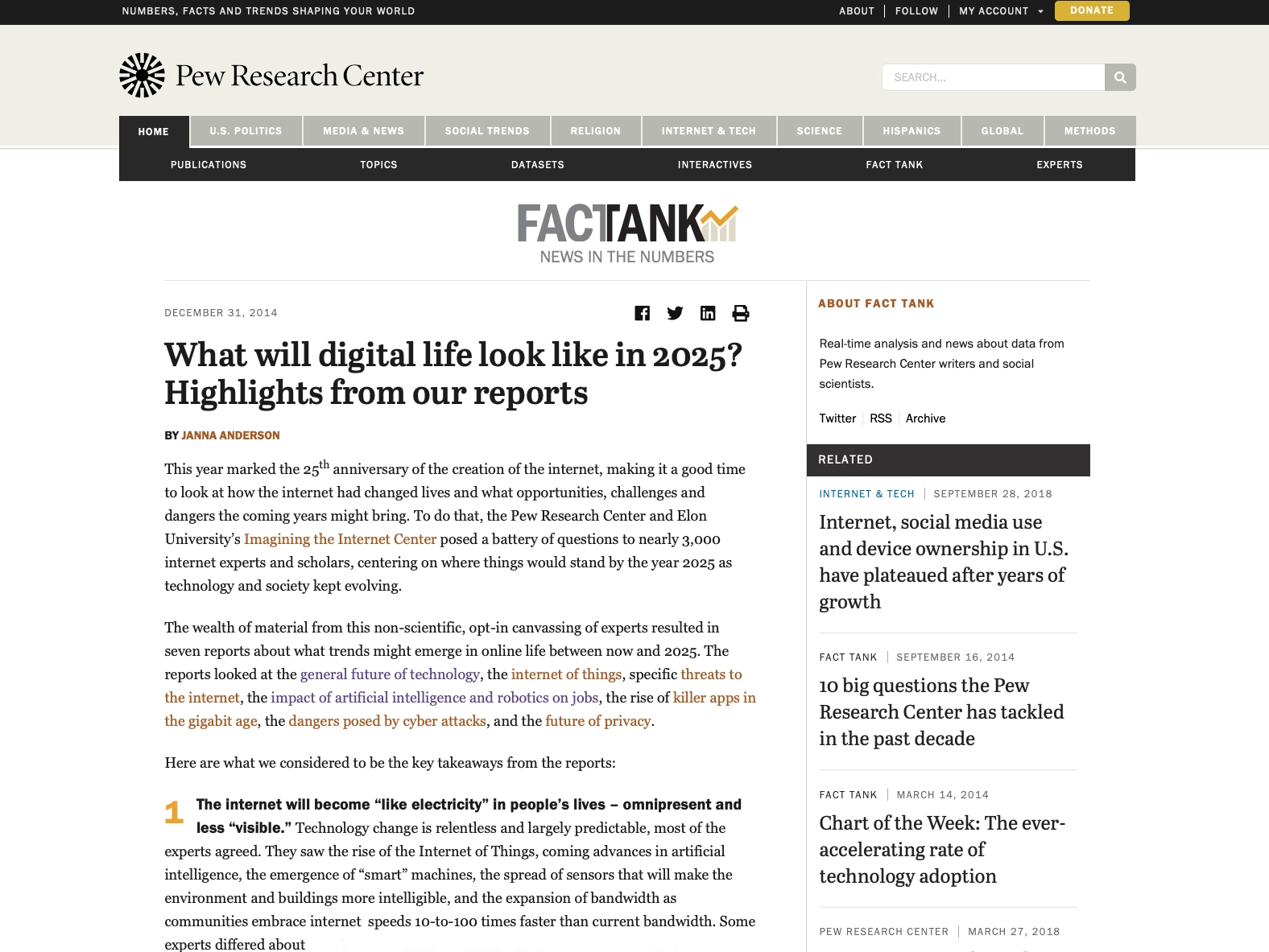Das angesehen PEWResearchCenter prognostizierte im März 2014 in »Digital Life in 2025«, dass das Internet im Jahre 2025 für uns wie Elektrizität sein wird – omnipräsent und kaum sichtbar. Damit wird es fundamentale Bereiche der menschlichen Aktivitäten wie Lernen, Arbeiten, Denken sowie soziale Interaktionen wesentlich beeinflussen.