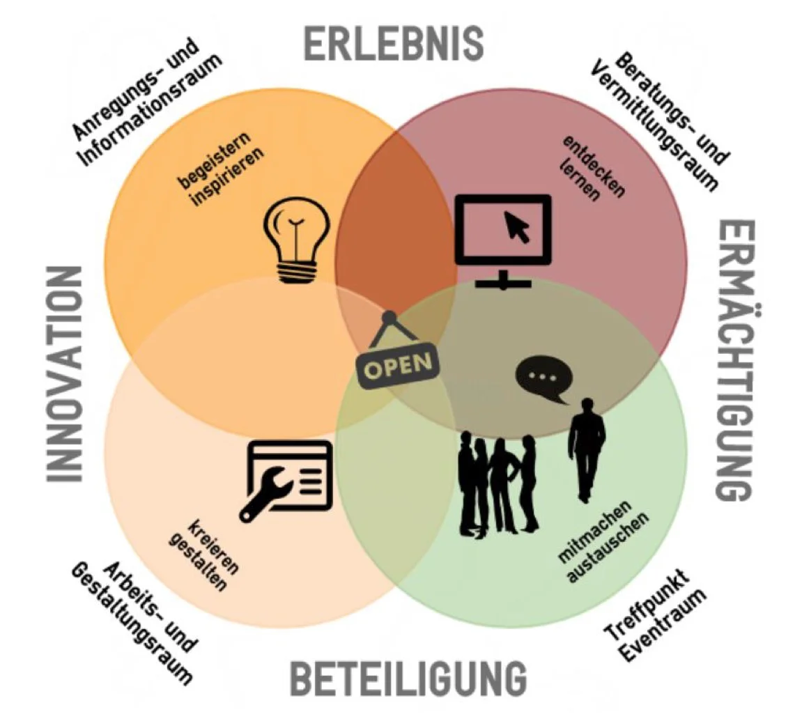 H. Jochumsen, D. Skor-Hansen und C.H. Rasmussen haben in ihrem Artikel The four new spaces – A new Model for the public library die vier Elemente einer Lernumgebung definiert.